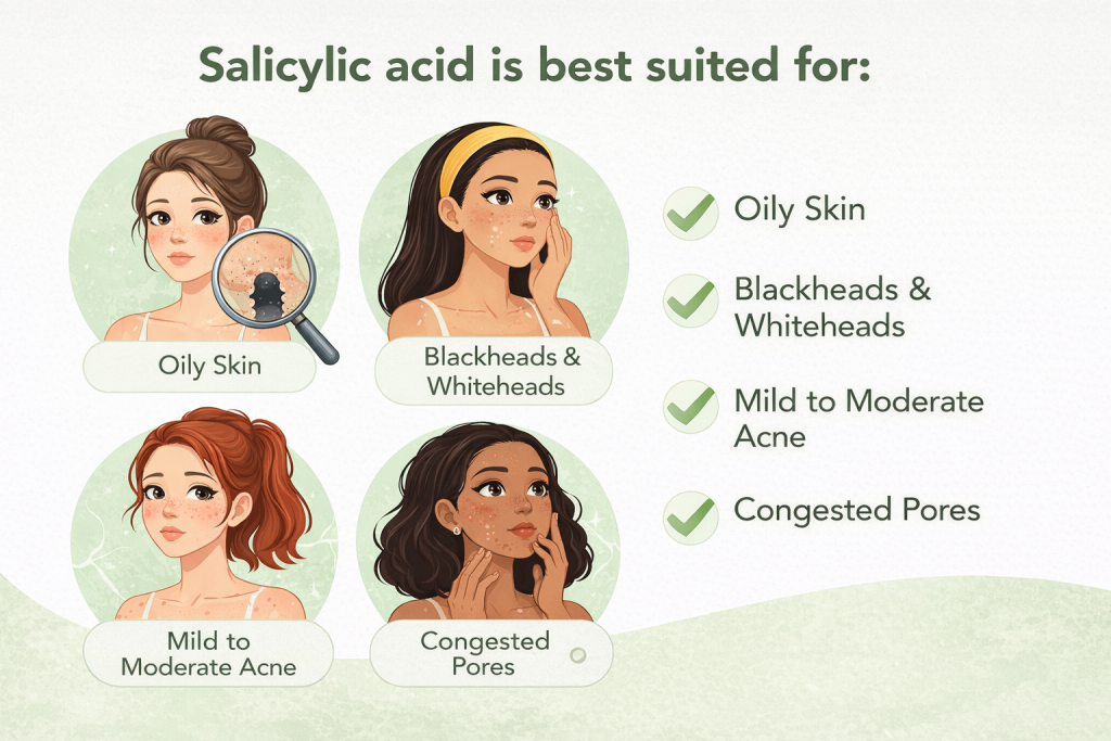 Salicylic acid helps treat acne by penetrating deep into pores, dissolving excess oil and dead skin cells, and reducing inflammation. It is most effective for blackheads and whiteheads and works best on oily or acne-prone skin.